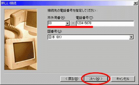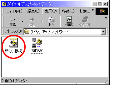 - 「マイコンピュータ」→「ダイアルアップネットワーク」と開き、「新しい接続」をダブルクリックします。