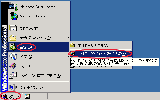 - 「スタート」→「設定」→「ネットワークとダイアルアップ接続」と選択して、ダイアルアップネットワークの画面を表示します。