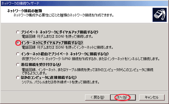 「インターネットにダイアルアップ接続する(D)」を選択します。