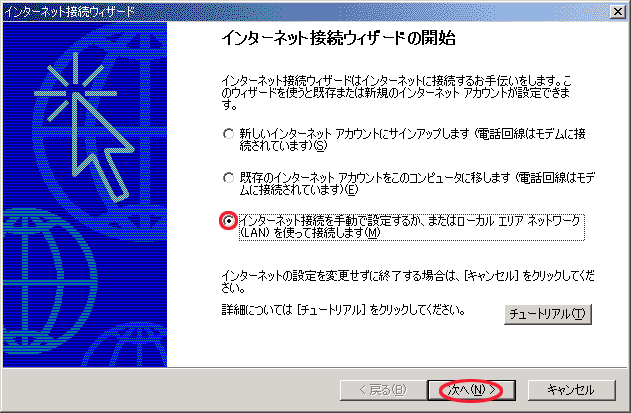 「インターネット接続を手動で設定するか、またはローカルエリアネットワーク(LAN)を使って接続します。(M)」を選択。