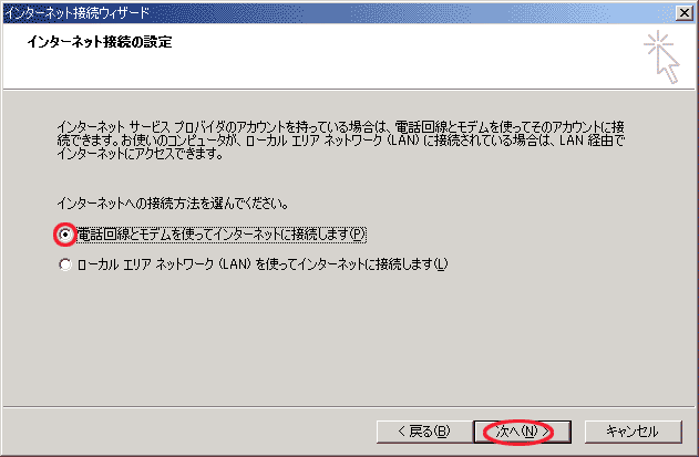 「電話回線とモデムを使ってインターネットに接続します(P)」を選択します。