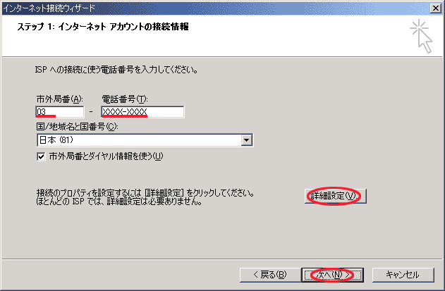 ※フレッツ・ISDNをお使いの場合は、「市外局番(A)」を空にして、「電話番号(T)」に 1861492 と入力して下さい。