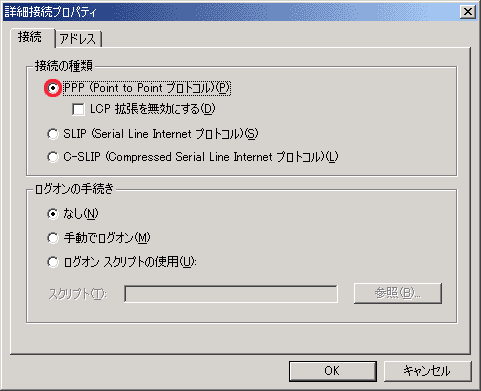 ダイアルアップサーバの種類は「PPP:Windows 95/98/NT4/2000,Internet」を選択。
