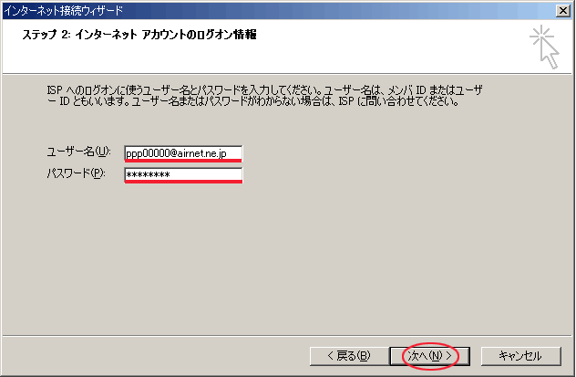 「ユーザ名(U)」にPPPアカウント@airnet.ne.jpと入力します。