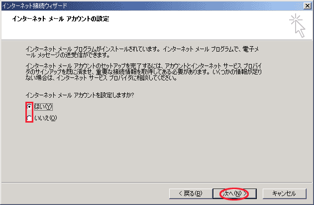 メールソフトに Outlook Expressを利用する方は「はい(Y)」を選択し「次へ(N)」を押します。
