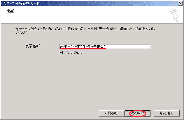 この名前は、メールの受信者に表示される名前ですが、世界中の誰でも読めるようにローマ字で入力されることをお奨めします。