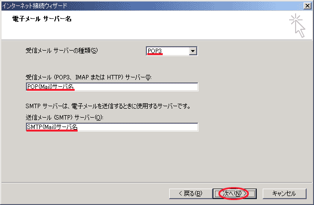 - Outlook Expressの設定−メールサーバ名を入力します。
