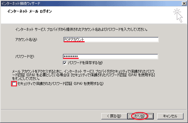 「セキュリティで保護されたパスワード認証(SPA)を使用する(S)」のチェックは外します。