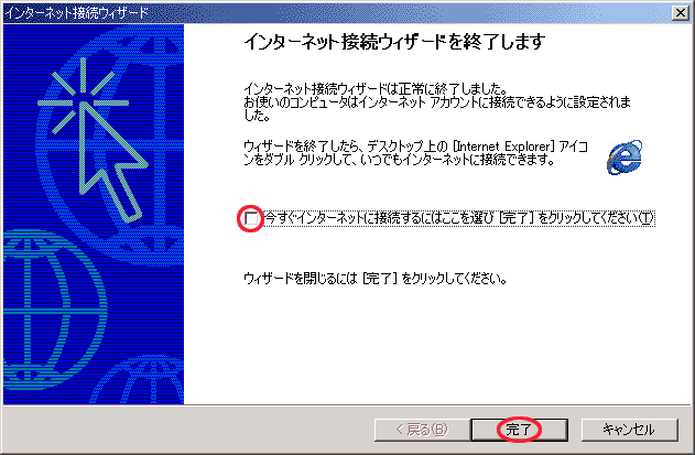 「今すぐインターネットに接続するにはここを選び[完了]をクリックしてください(T)」のチェックを外し「完了」を押します。