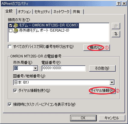 電話番号に、最寄のAIRnetのアクセスポイントの電話番号が設定されていることを確認します。