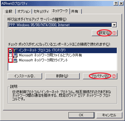 「ユーザ名(U)」にPPPアカウント@airnet.ne.jpが表示されていることを確認。