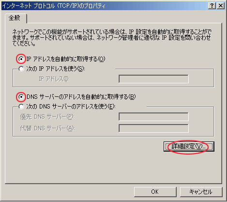 「DNSサーバーのアドレスを自動的に自動的に取得する(B)」を選択。