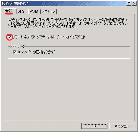 「リモートネットワークでデフォルトゲートウェイを使う(U)」をチェックする。