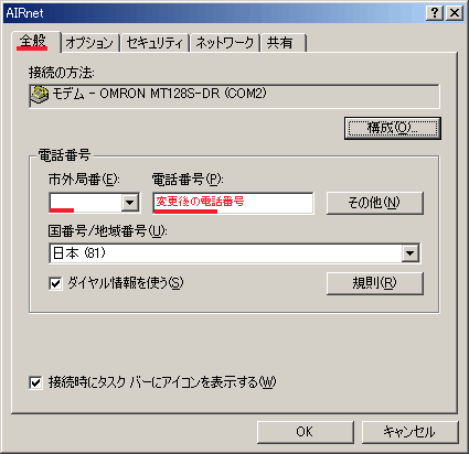 ※フレッツ・ISDNをお使いの場合は、「市外局番(E)」を空にして、「電話番号(P)」に 1861492 と入力して下さい。