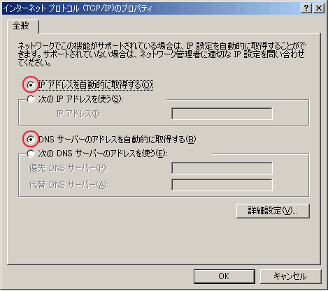 「DNSサーバーのアドレスを自動的に取得する(B)」を選択。